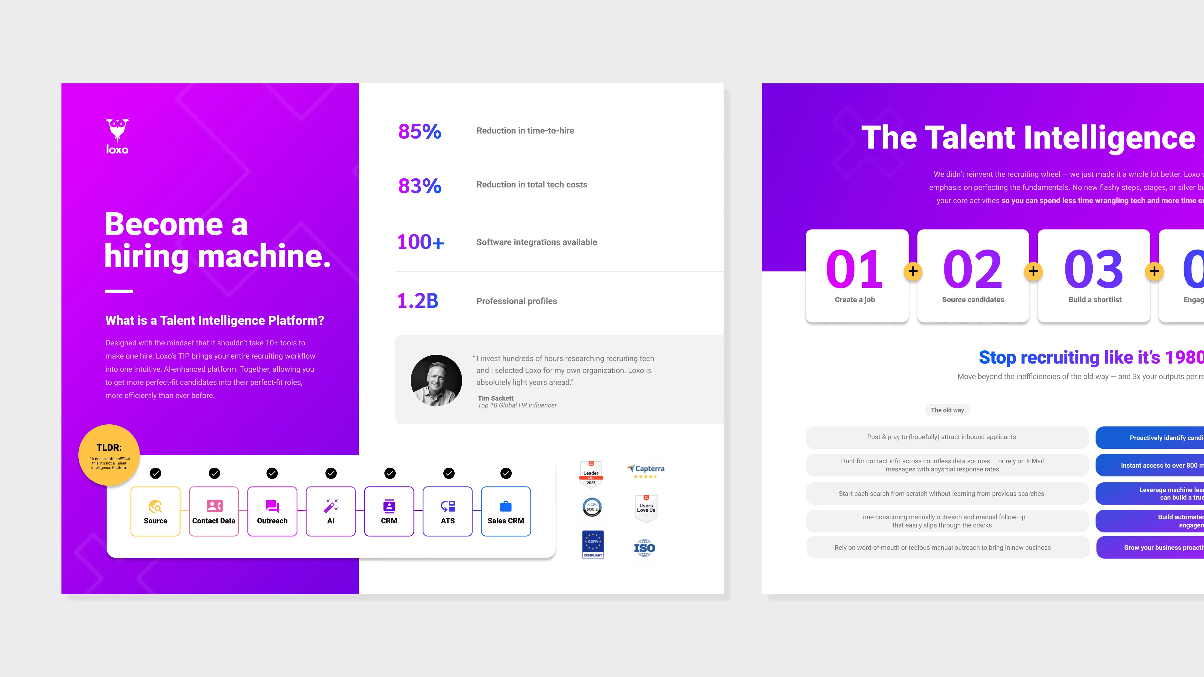 Loxo was in need of a Brand Refresh to revitalize their visual identity and continue to position themselves as the category leader in recruiting software. Without a design system or brand guidelines, our goal was to not only breathe new life into the brand but create a system that allowed for consistent visual and verbal language.